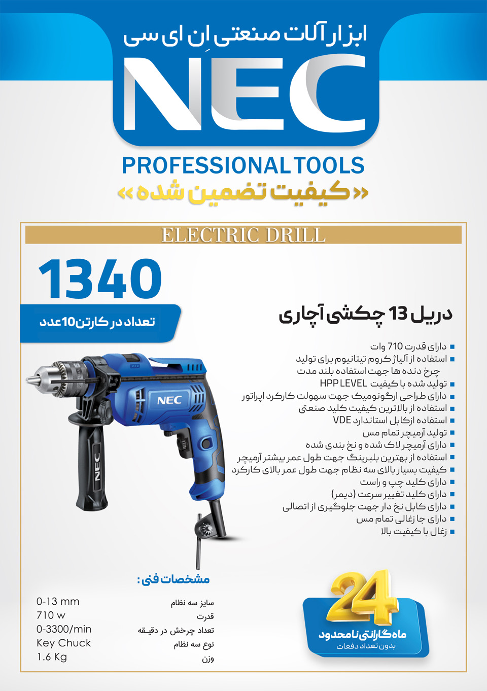 سایر مشخصاتتعداد چرخش دور در دقیقه 0-3300/min قدرت 710 w وزن 1.5 kg نوع سه نظام key ch