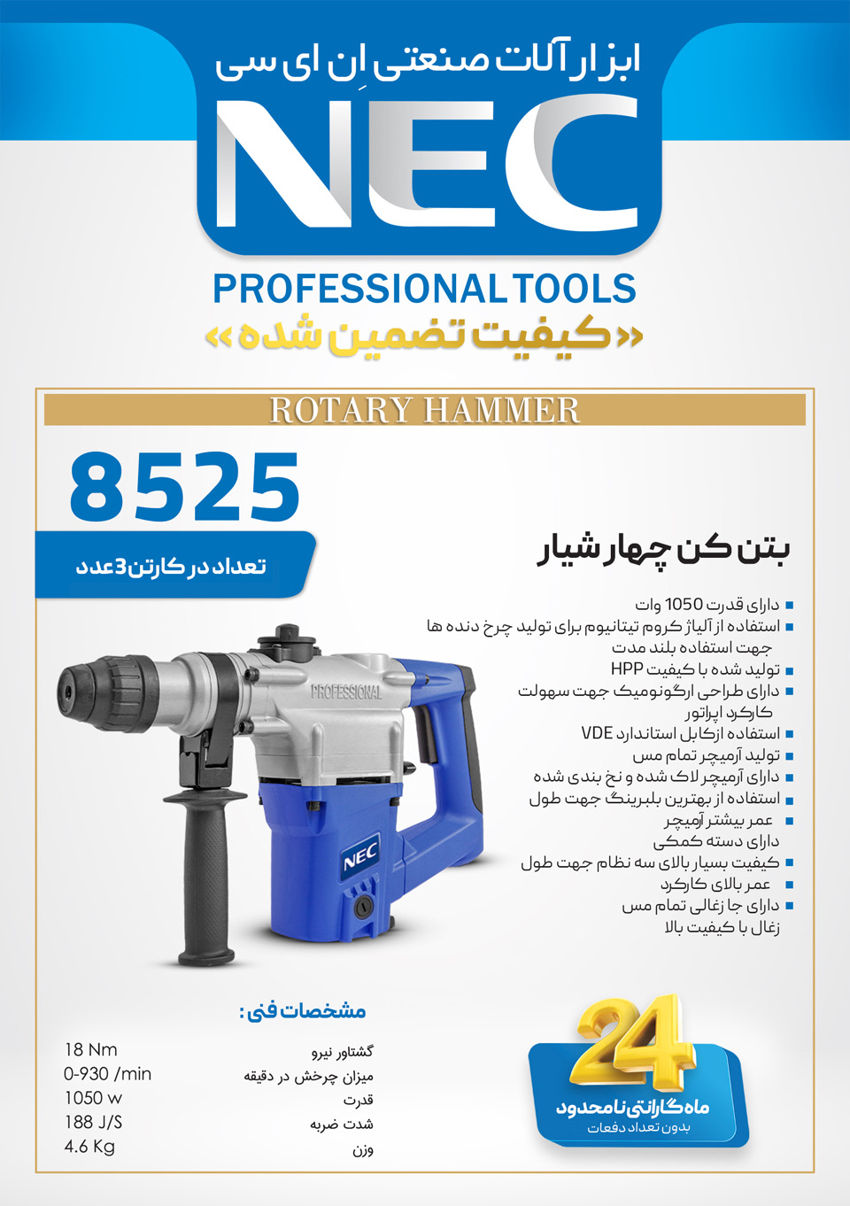 سایر مشخصاتگشتاور نیرو 18 Nm تعداد چرخش دور در دقیقه 0-800/min قدرت 1050 w وزن 4.6 kg شدت ضربه 188 J/S قابلیت مته گیری 26