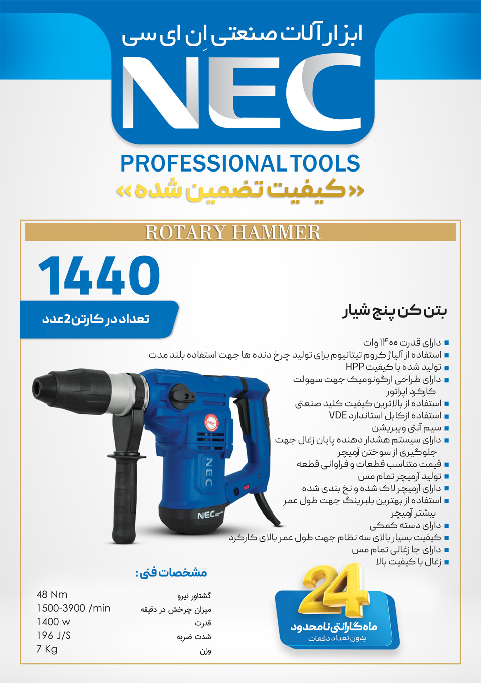 سایر مشخصاتگشتاور نیرو 73 Nm تعداد چرخش دور در دقیقه 0-500/min قدرت 1400 w وزن 7.5 kg/td> شدت ضربه 428 J/S قابلیت مته گیری 45