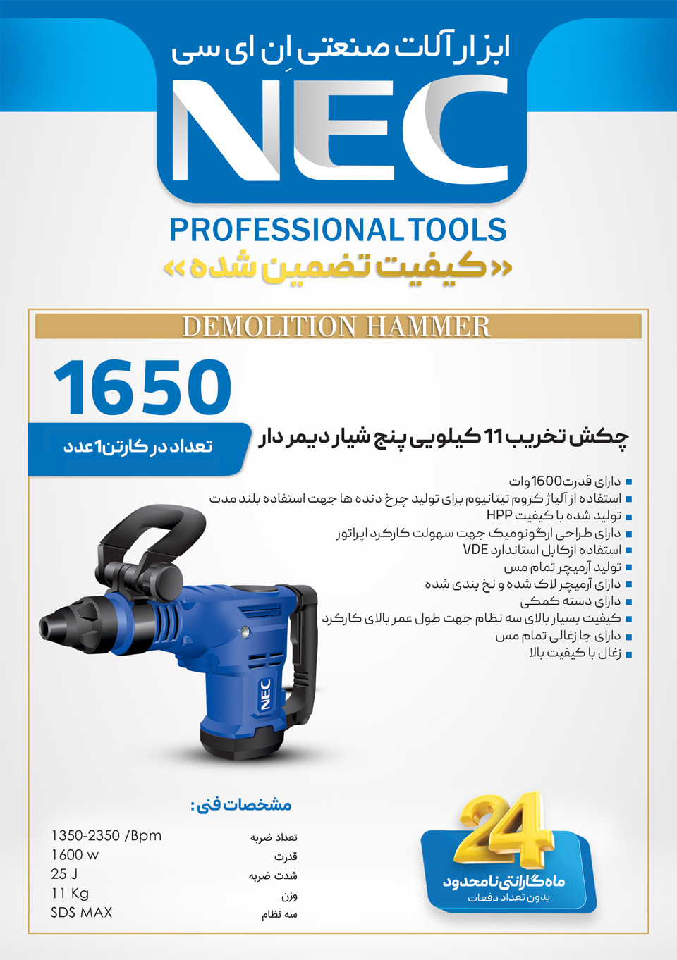 سایر مشخصاتقدرت 1600 w وزن 11 kg سه نظام SDS max تعداد ضربه 1350-235/Bpm شدت ضربه 2-25 J